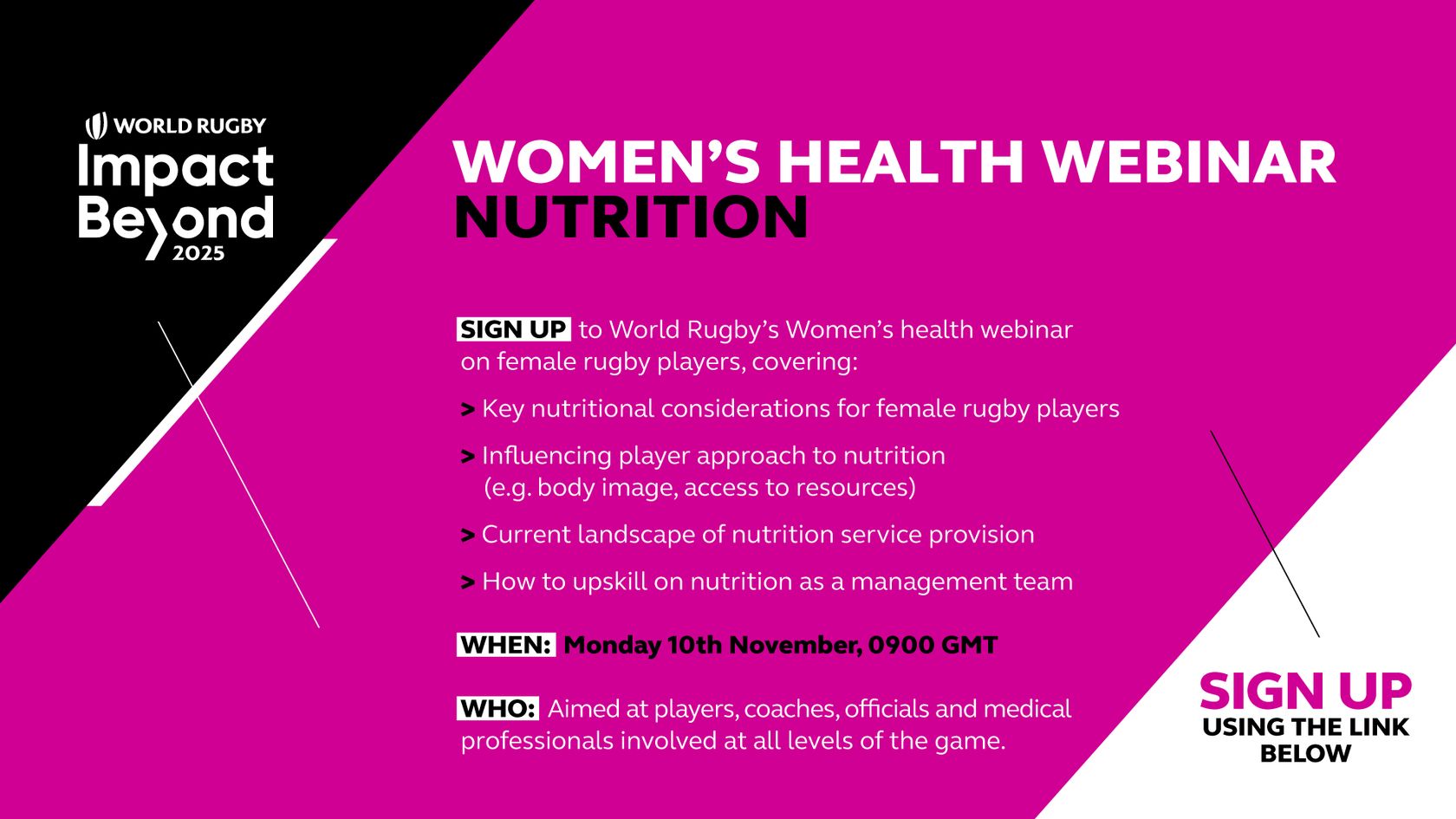 The fourth of World Rugby’s Impact Beyond 2025 women’s health webinars will focus on nutrition for female rugby players. This session builds on the huge success of Women’s Rugby World Cup 2025 and increased interest in the women’s game and is part of World Rugby’s Impact Beyond 2025 legacy programme around the tournament. It is part of a wider webinar series providing women and girls who play the sport with better awareness of health issues which often aren’t as openly discussed as they could be.